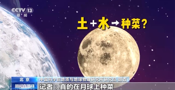 中国科学院地质与地球物理研究所研究员胡森:如果要在月球种菜的话,无土栽培可能是最好的技术手段,因为目前来看,月球上不仅要有水,种菜的话还要有有机质,可能还有很远的路要走。